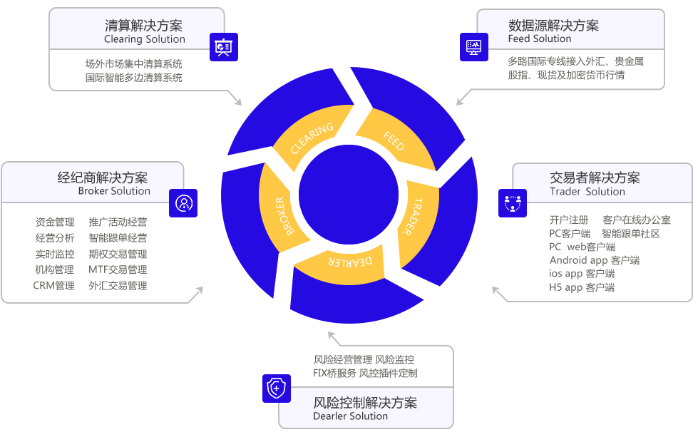 经过十五年行业探索,结合众多客户项目的运营需求与经验,成功打造MT5外汇交易系统,以五个Solution为基础,为交易所(经纪商)提供性能稳定、安全可靠的配套软件产品和服务。